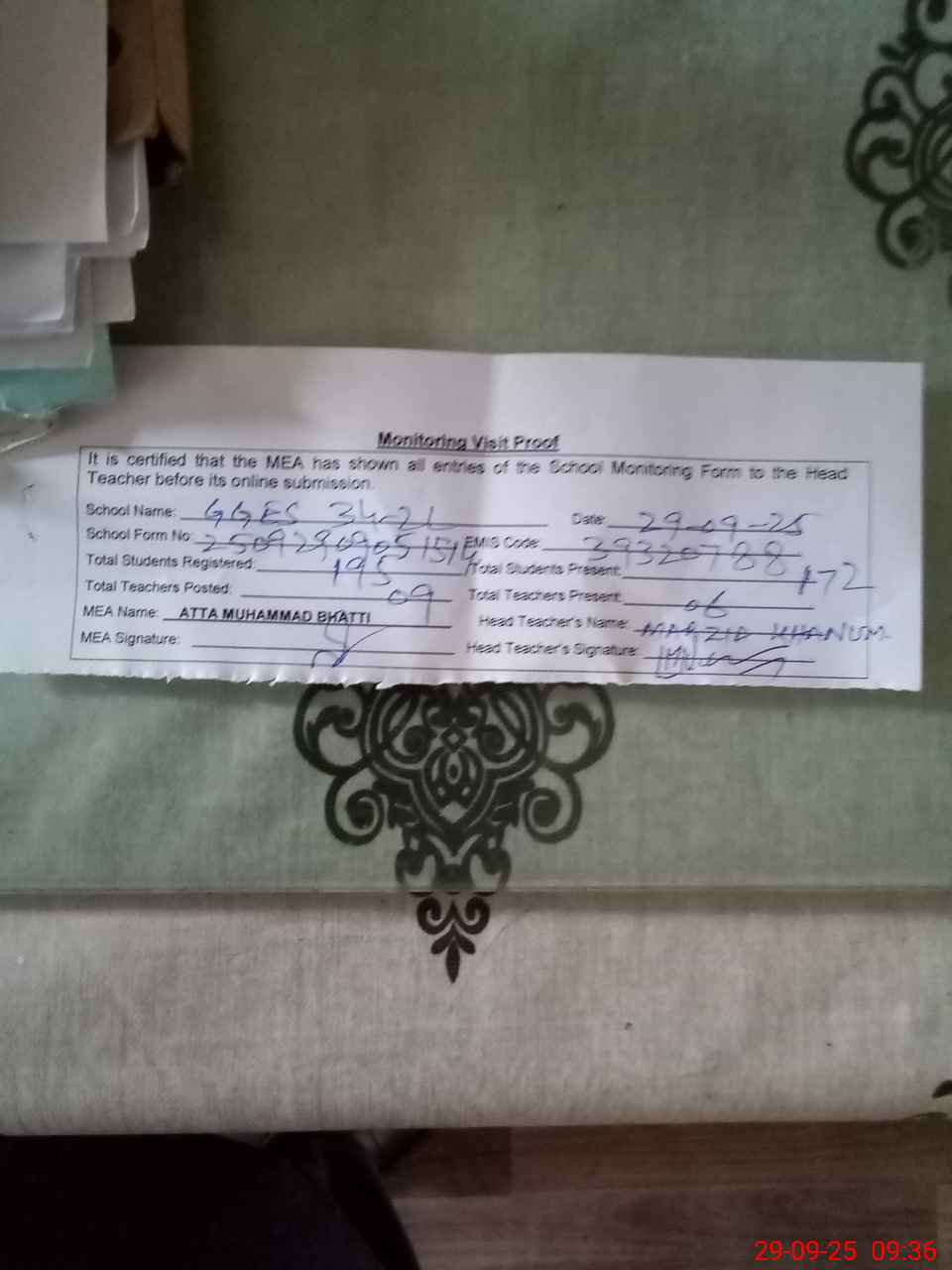 | Attendance Register | Head Teacher | MEA with School | Visit Proof |