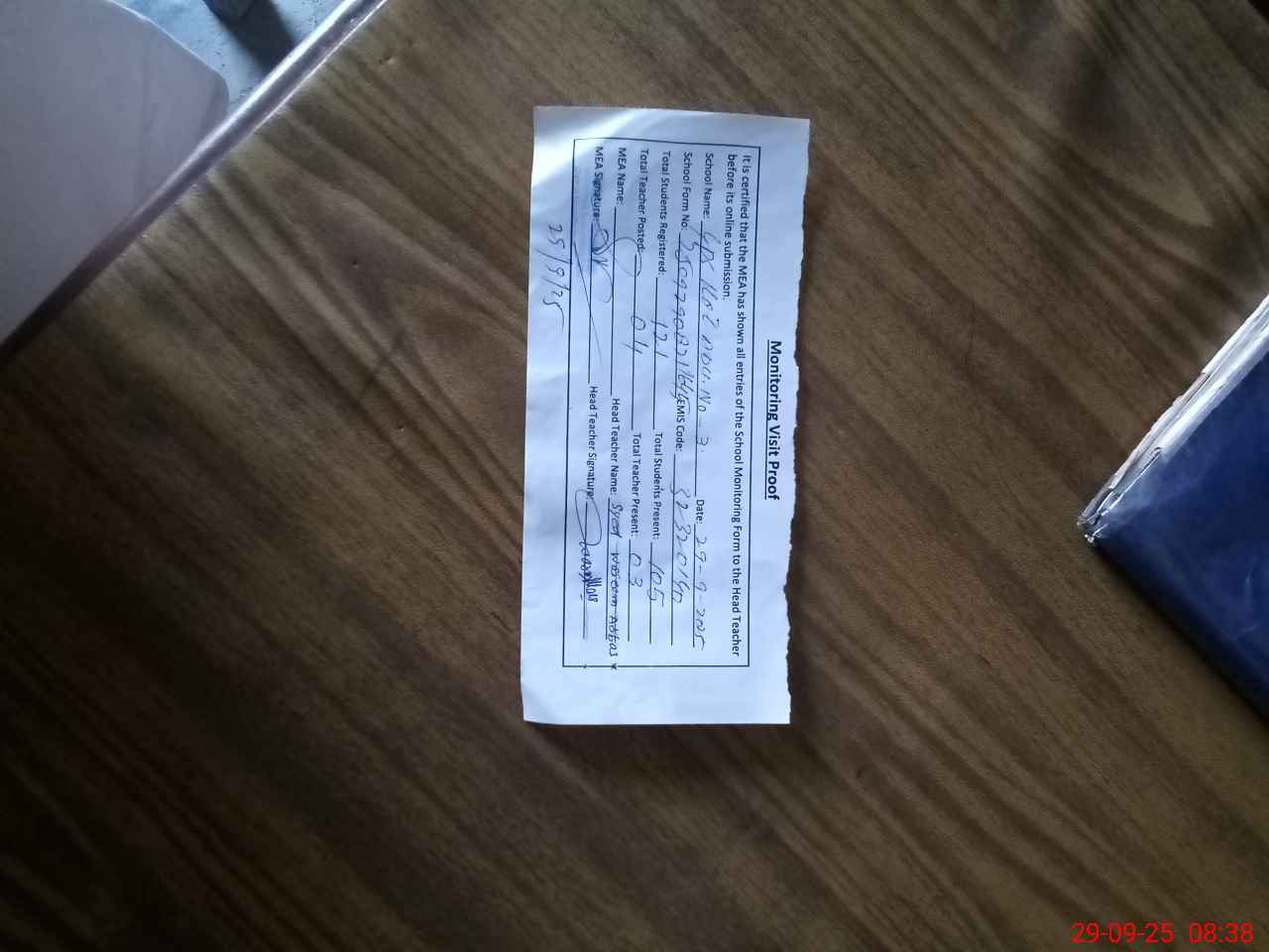 | Attendance Register | Head Teacher | MEA with School | Visit Proof |