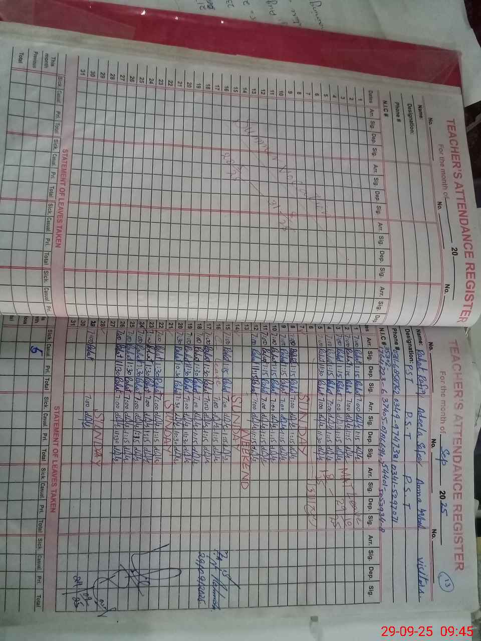 | CNIC | Full Name | Designation | R/C | Absence During Last Calender Month |