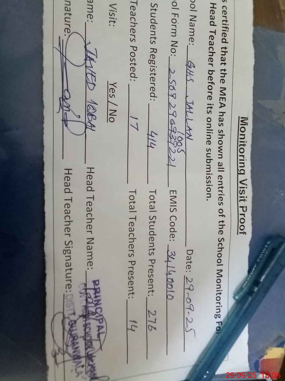 | Certified that this School was Inspected by the Undersigned MEA/DMO Today and the Information Stated Above is as Per Record. | |||||