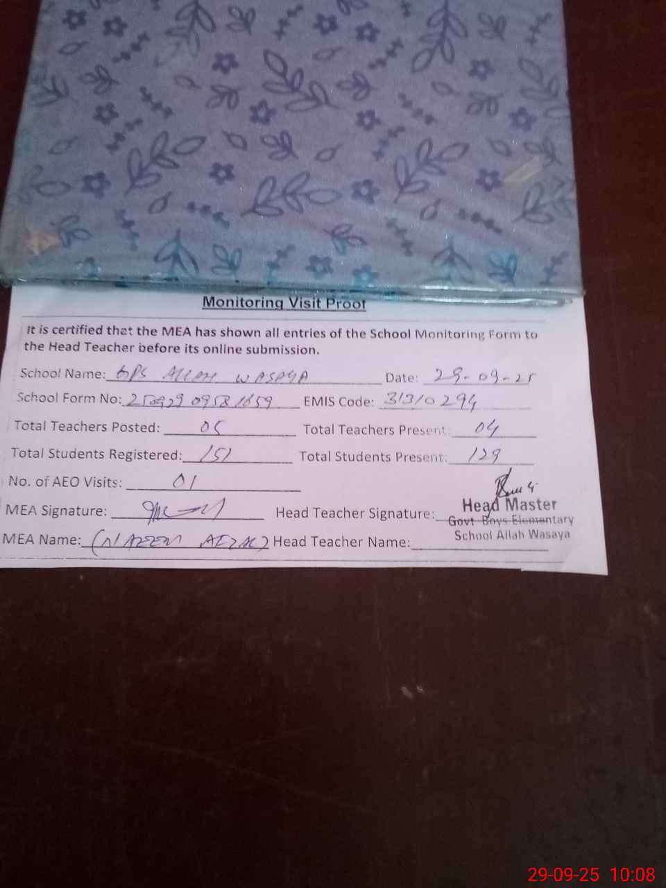 | Attendance Register | Head Teacher | MEA with School | Visit Proof |