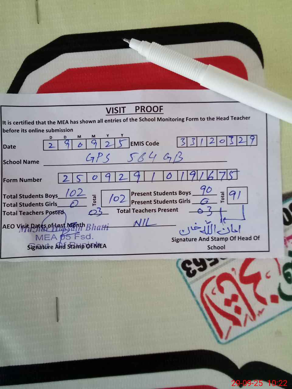 | Attendance Register | Head Teacher | MEA with School | Visit Proof |