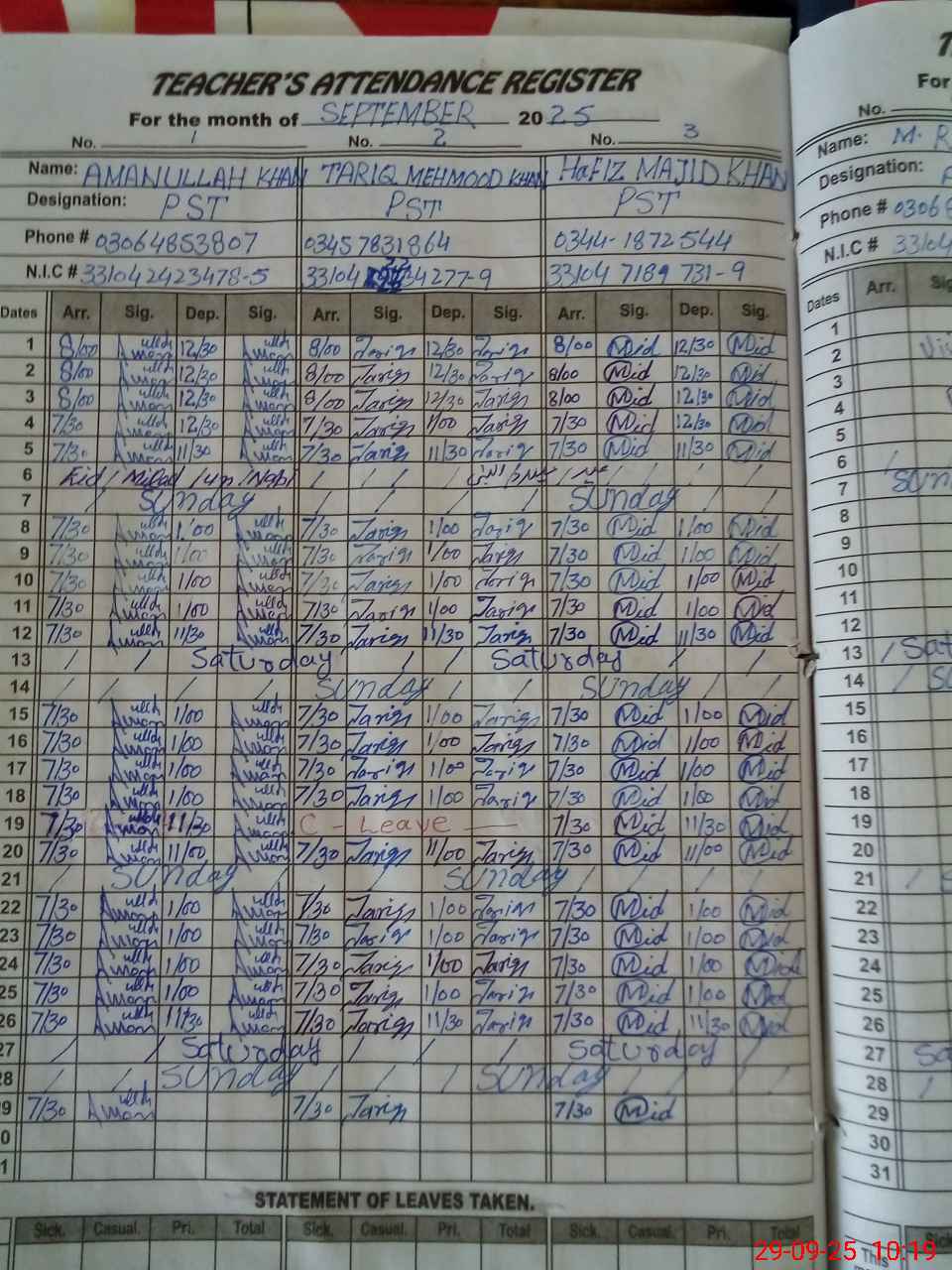 | CNIC | Full Name | Designation | R/C | Absence during last cal. month |