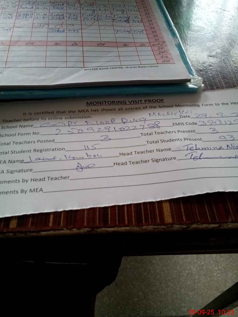 | Attendance Register | Head Teacher | MEA with School | Visit Proof |