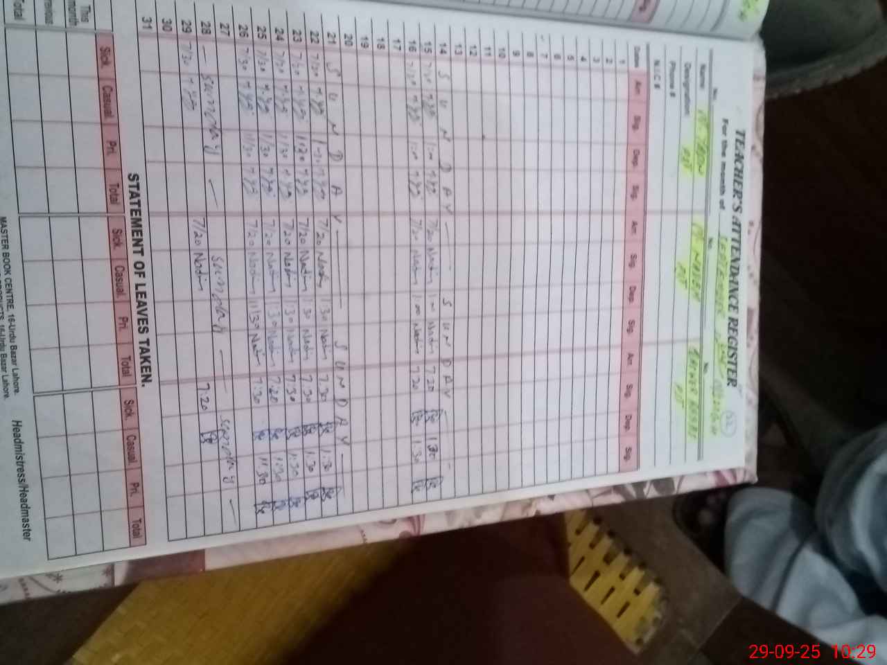 | CNIC | Full Name | Designation | R/C | Absence During Last Calender Month |