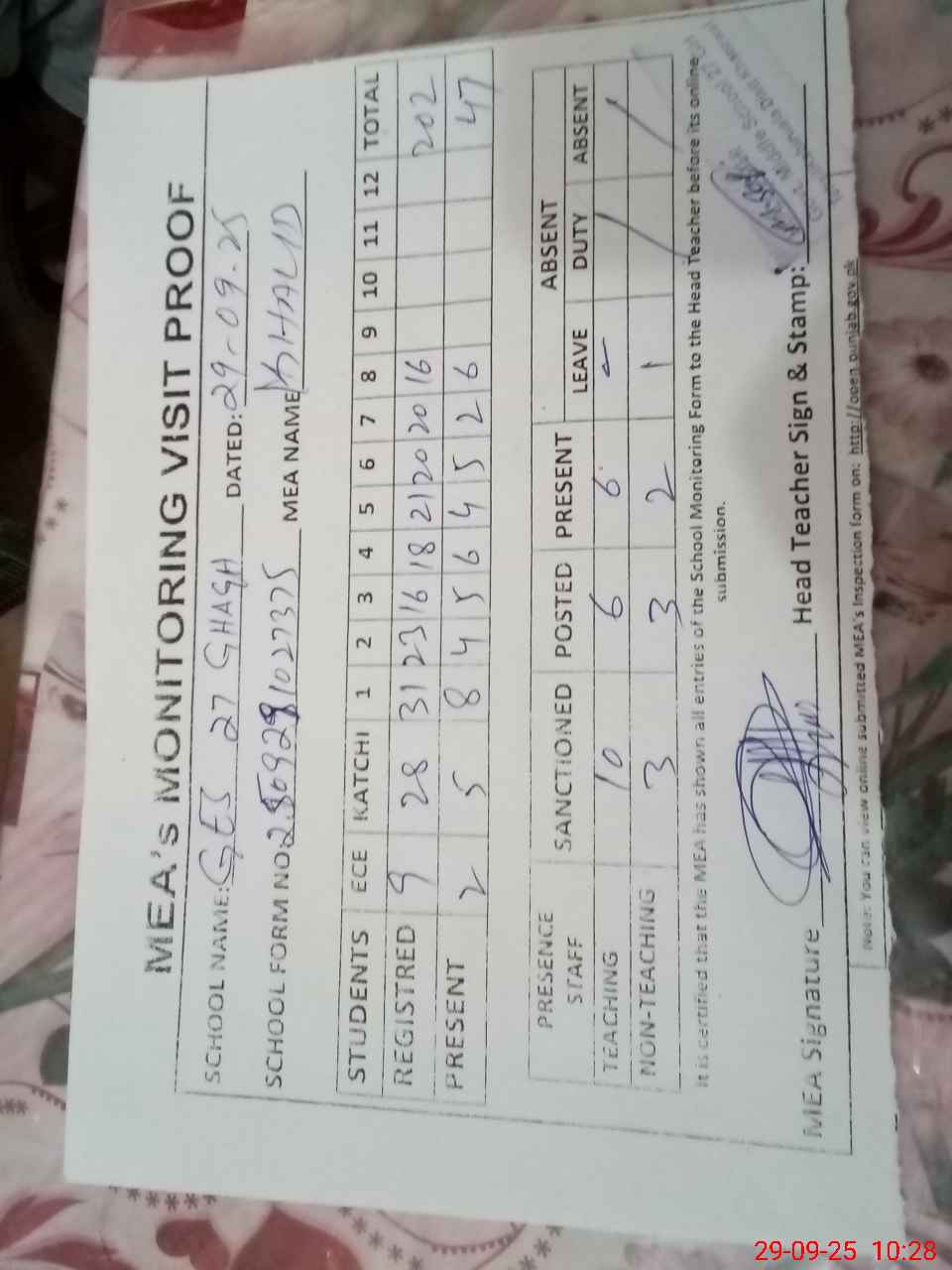 | Attendance Register | Head Teacher | MEA with School | Visit Proof |