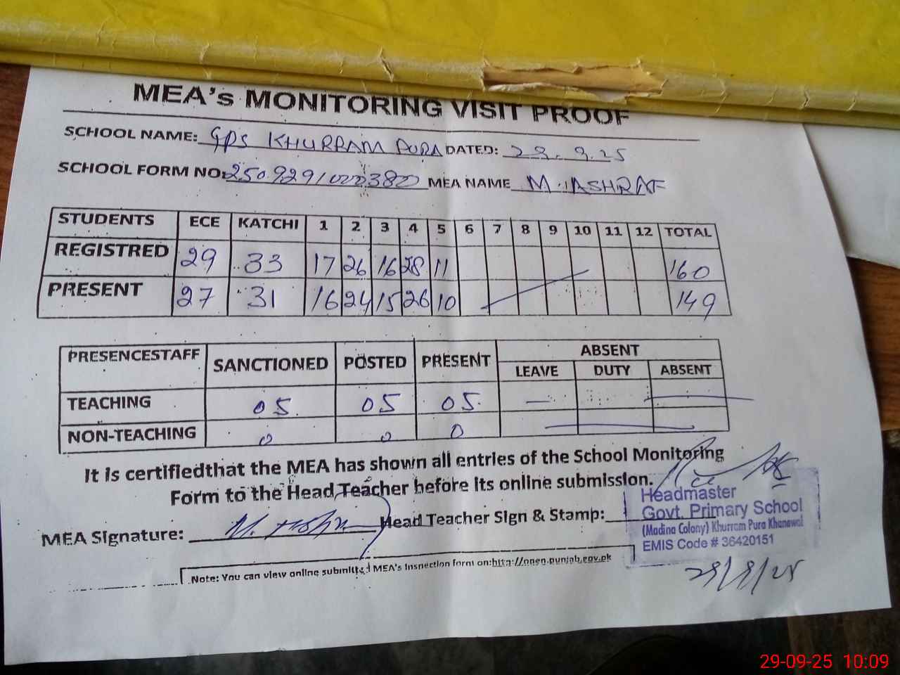 | Attendance Register | Head Teacher | MEA with School | Visit Proof |