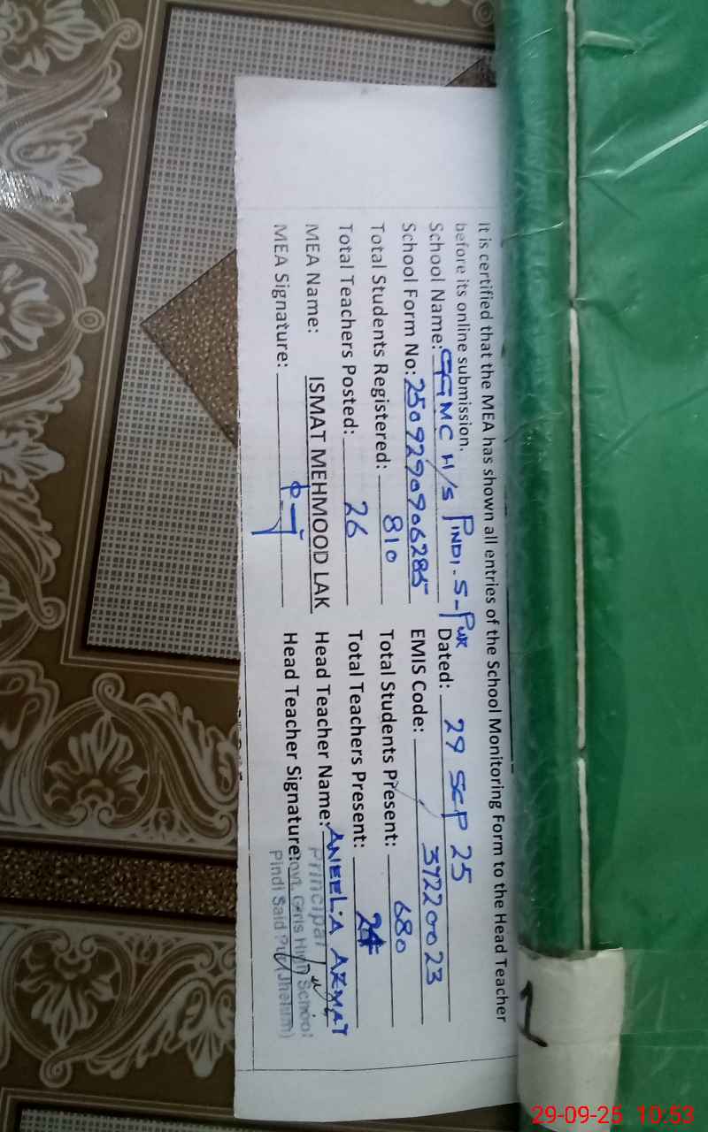 | EMIS Code: 37220023 | Name of School: GGHS MC PINDI SAID PUR | |||