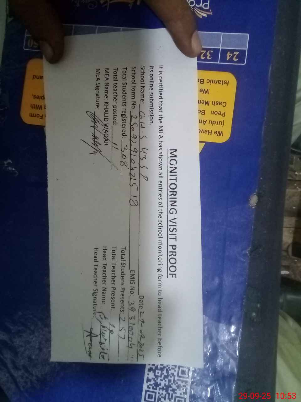 | Attendance Register | Head Teacher | MEA with School | Visit Proof |