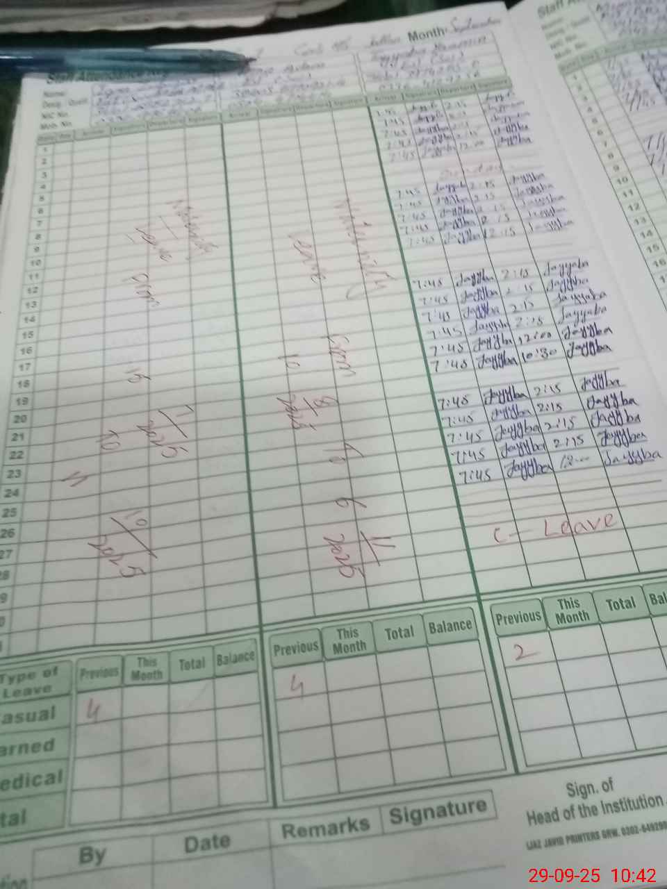 | CNIC | Full Name | Designation | R/C | Absence During Last Calender Month |