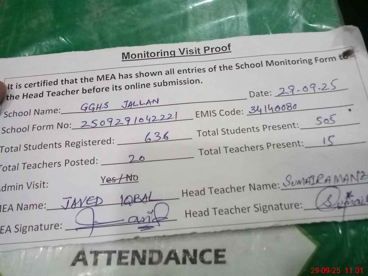 | Attendance Register | Head Teacher | MEA with School | Visit Proof |