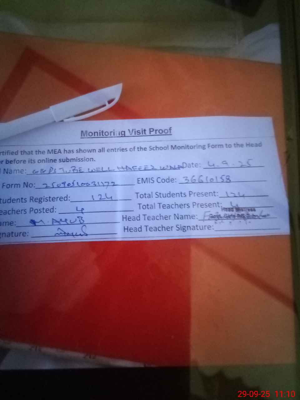 | Attendance Register | Head Teacher | MEA with School | Visit Proof |