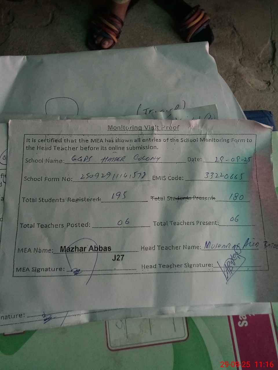 | Attendance Register | Head Teacher | MEA with School | Visit Proof |