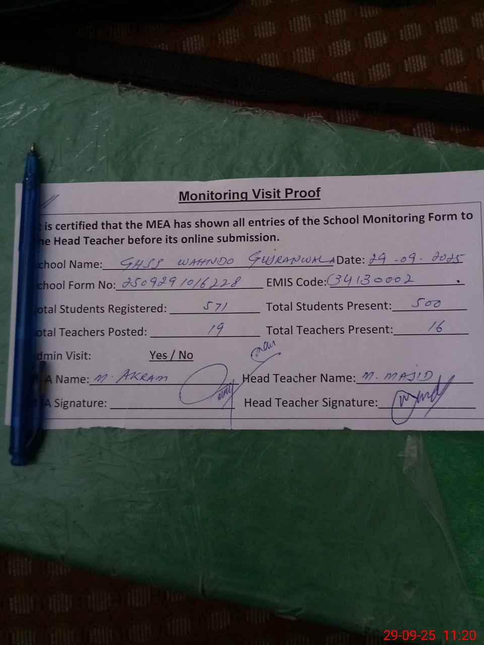 | Attendance Register | Head Teacher | MEA with School | Visit Proof |