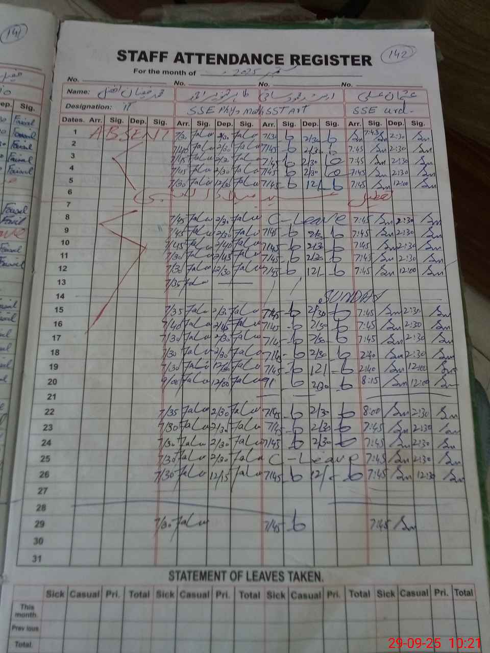 | CNIC | Full Name | Designation | R/C | Absence during last cal. month |