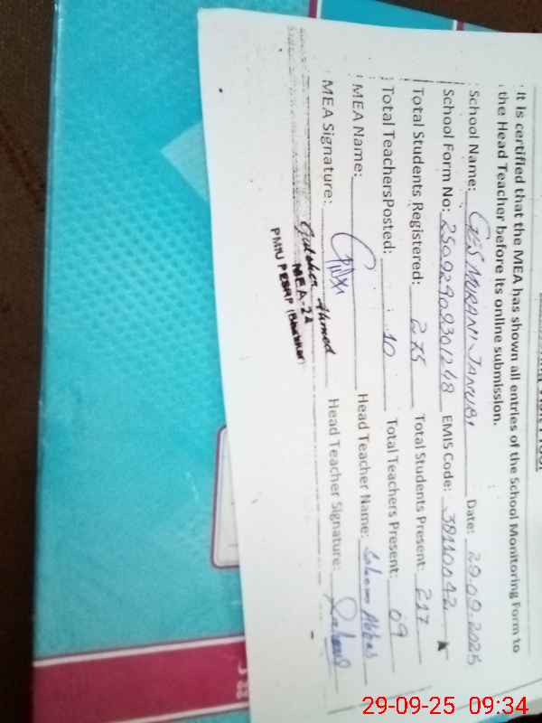 | Attendance Register | Head Teacher | MEA with School | Visit Proof |