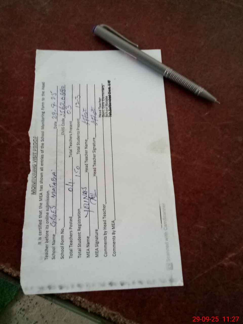 | Attendance Register | Head Teacher | MEA with School | Visit Proof |