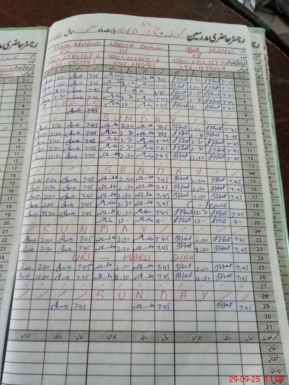 | CNIC | Full Name | Designation | R/C | Absence During Last Calender Month |