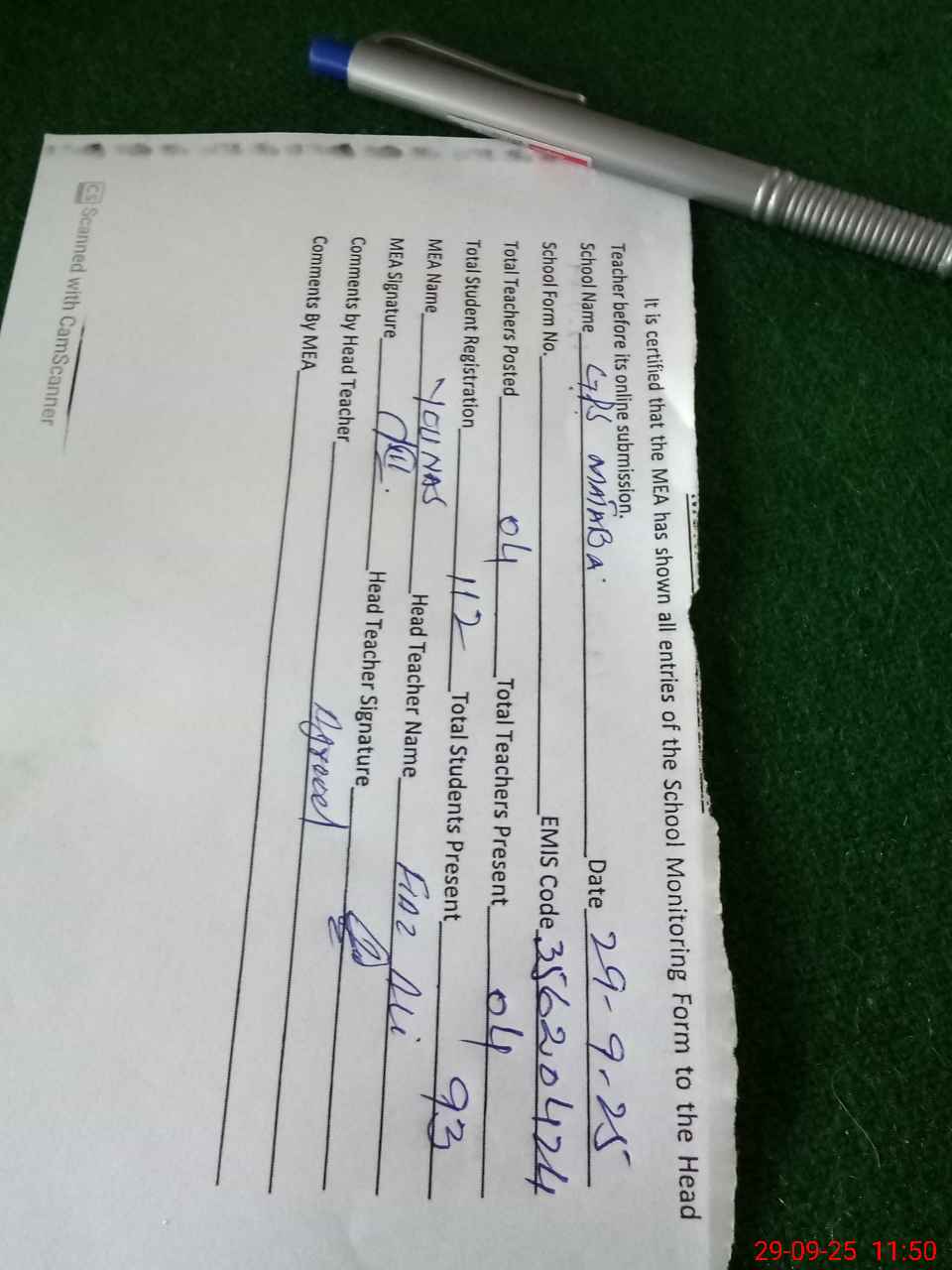 | Attendance Register | Head Teacher | MEA with School | Visit Proof |