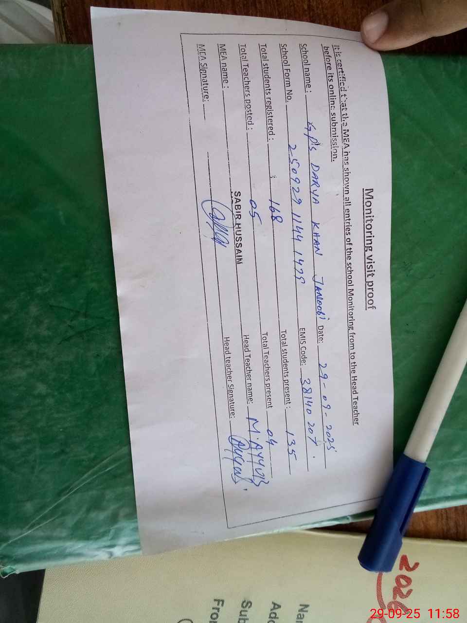 | Attendance Register | Head Teacher | MEA with School | Visit Proof |