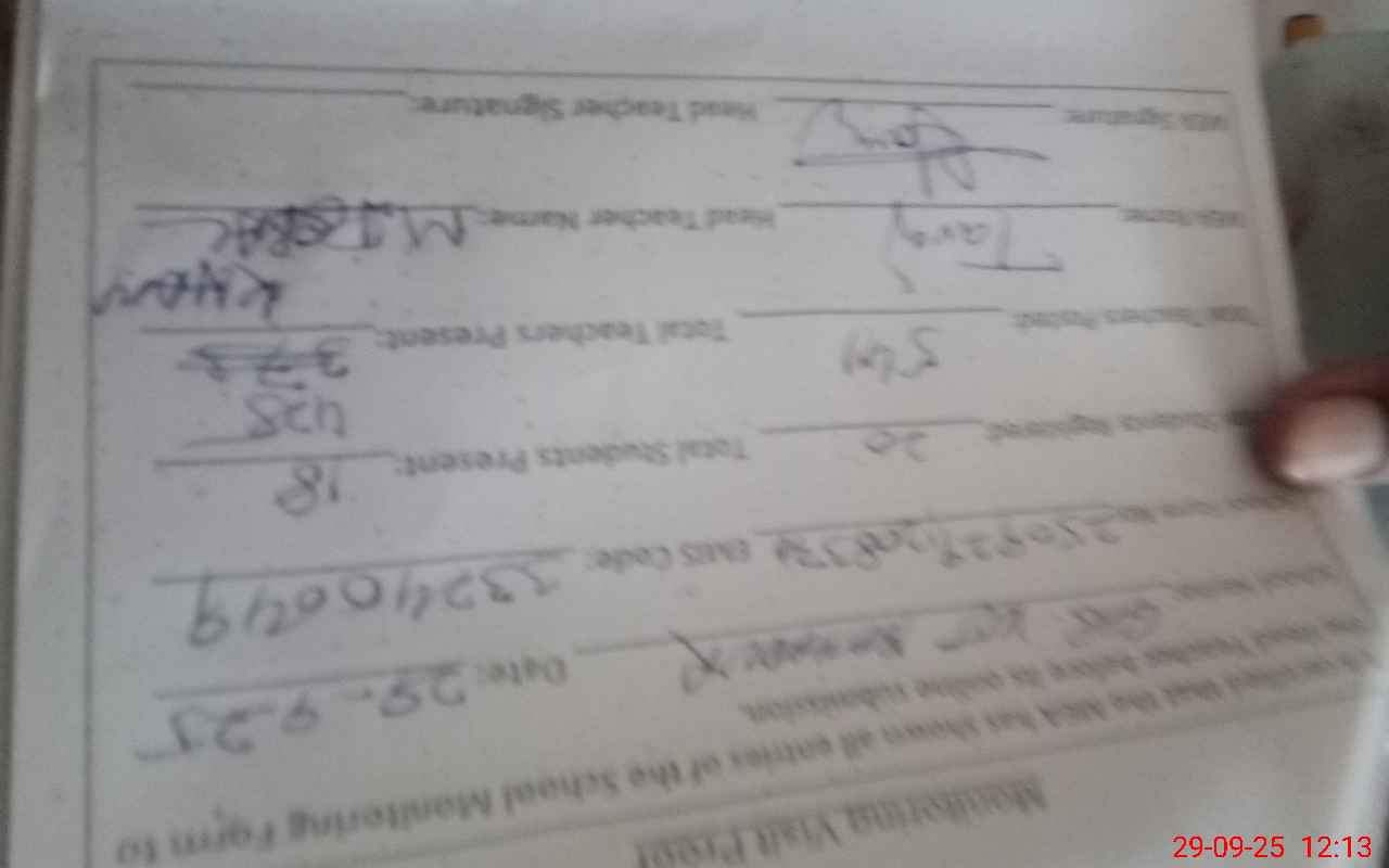 | Attendance Register | Head Teacher | MEA with School | Visit Proof |