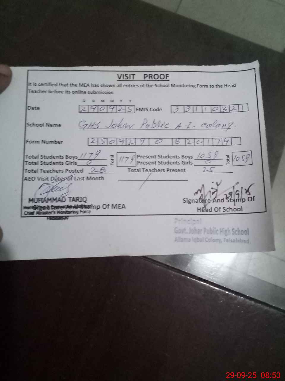 | EMIS Code: 33110321 | Name of School: GHS JOHAR PUBLIC ALLAMA IQBAL COLONY FSD | |||