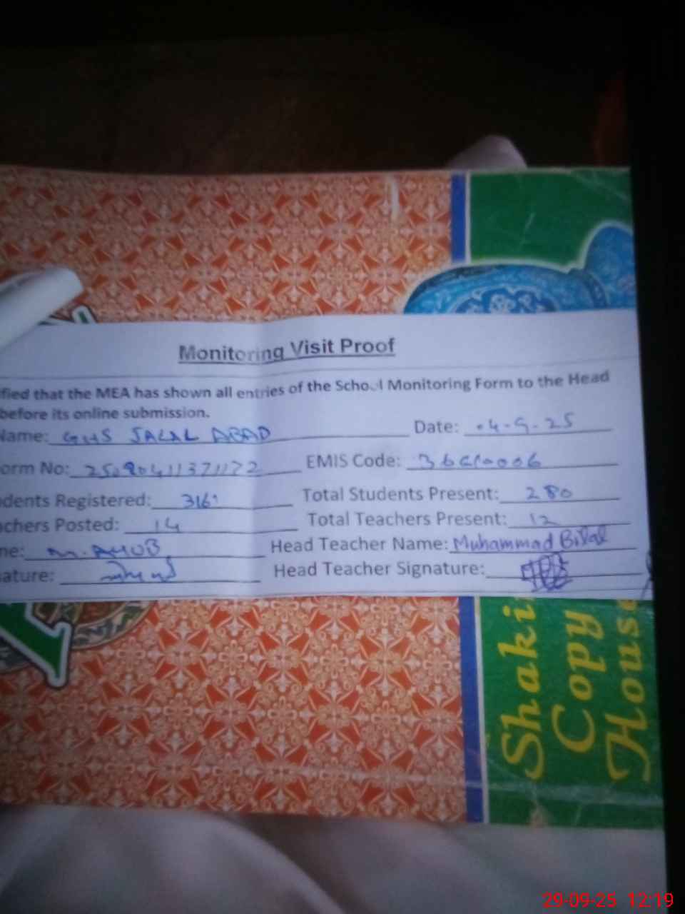| Attendance Register | Head Teacher | MEA with School | Visit Proof |