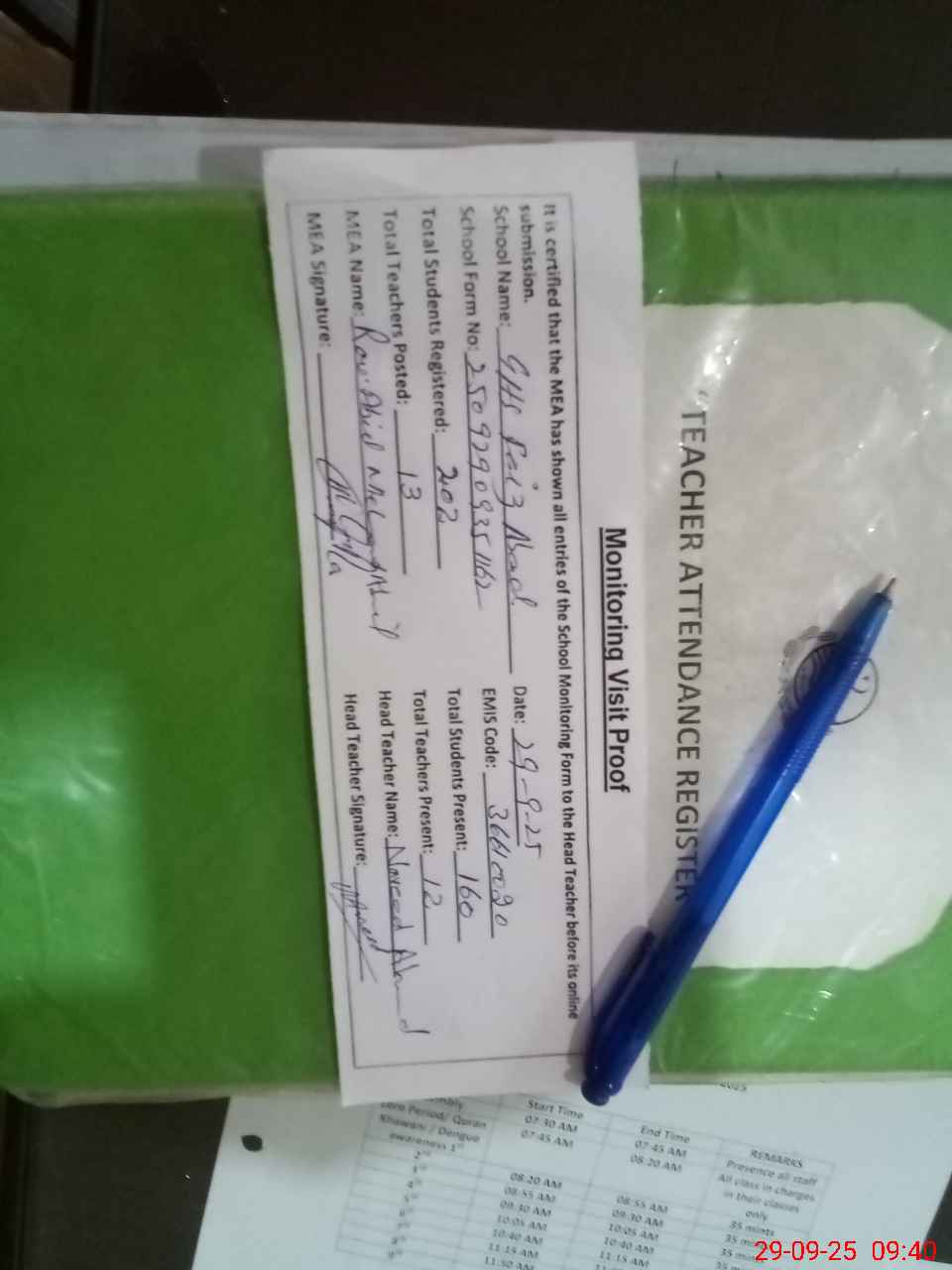 | Attendance Register | Head Teacher | MEA with School | Visit Proof |