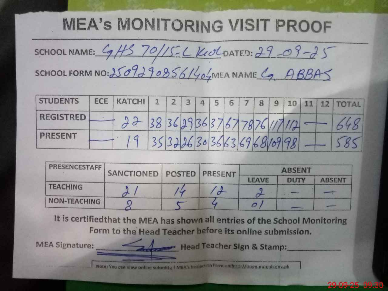 | Attendance Register | Head Teacher | MEA with School | Visit Proof |