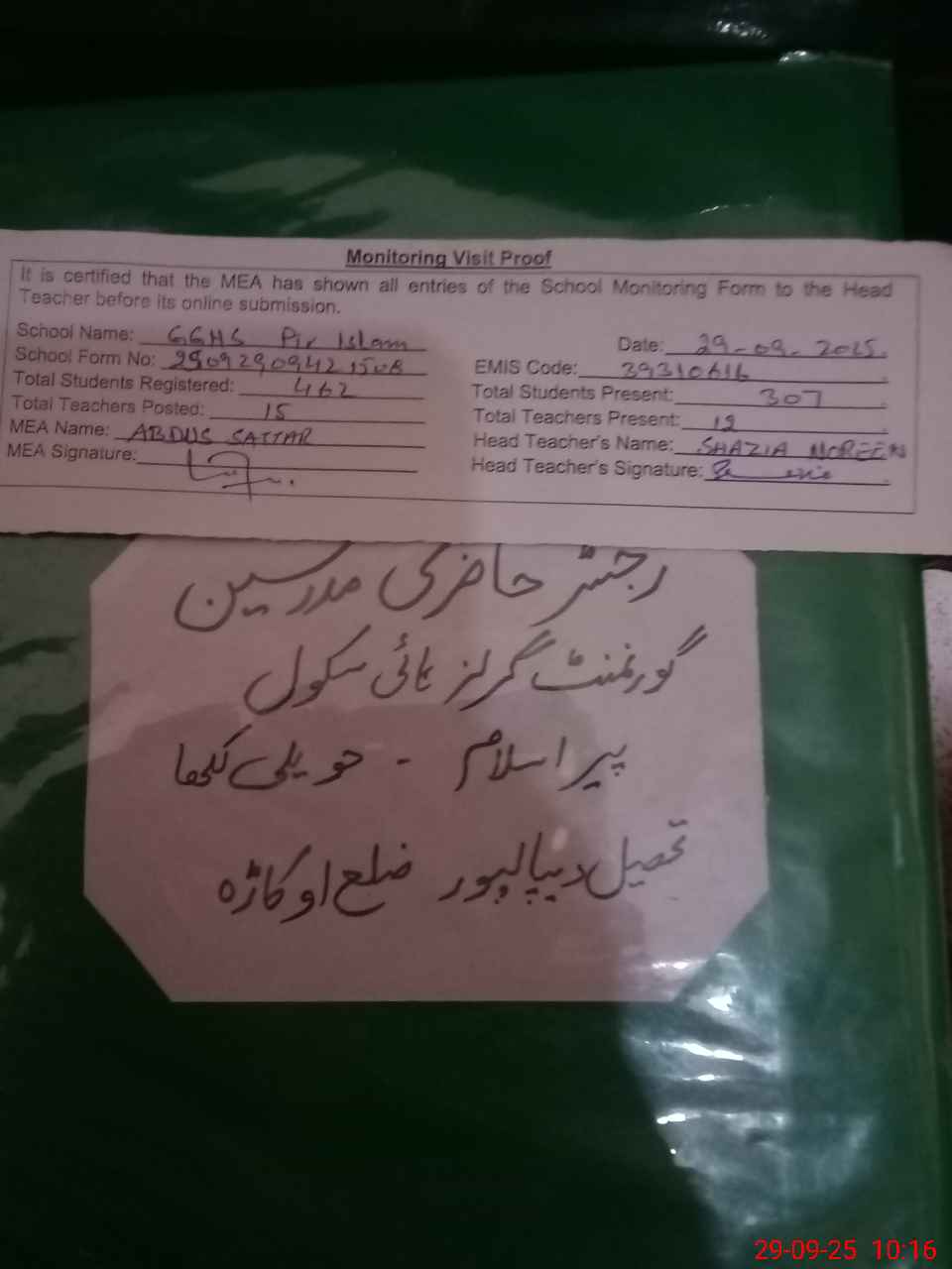 | EMIS Code: 39310616 | Name of School: GGHS PIR ISLAM | |||