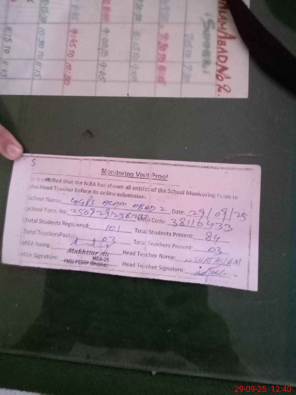 | Monitoring Date: 29-09-2025 | Start Time: 29-09-2025 11:49 AM | End Time: 29-09-2025 12:40 PM | Name of MEA: Mu**** Al**** | |