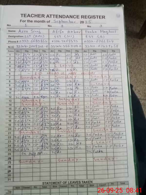 | 33**** | Az**** Si**** | SST | Regular | 0 | 0 | 0 | 0 | 0 | 0 | 0 | 0 | 0 | Exam Duty |