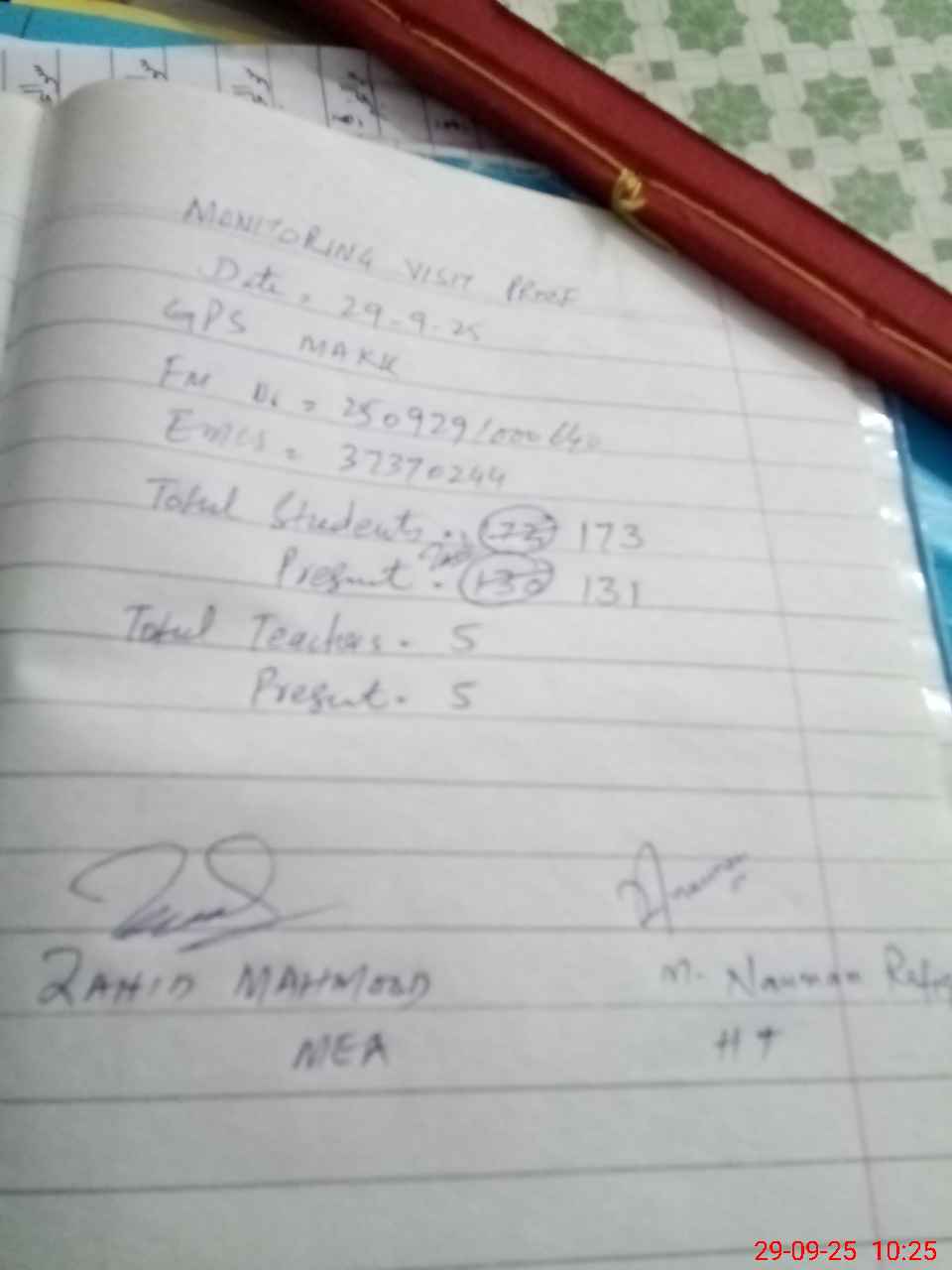 | Attendance Register | Head Teacher | MEA with School | Visit Proof |