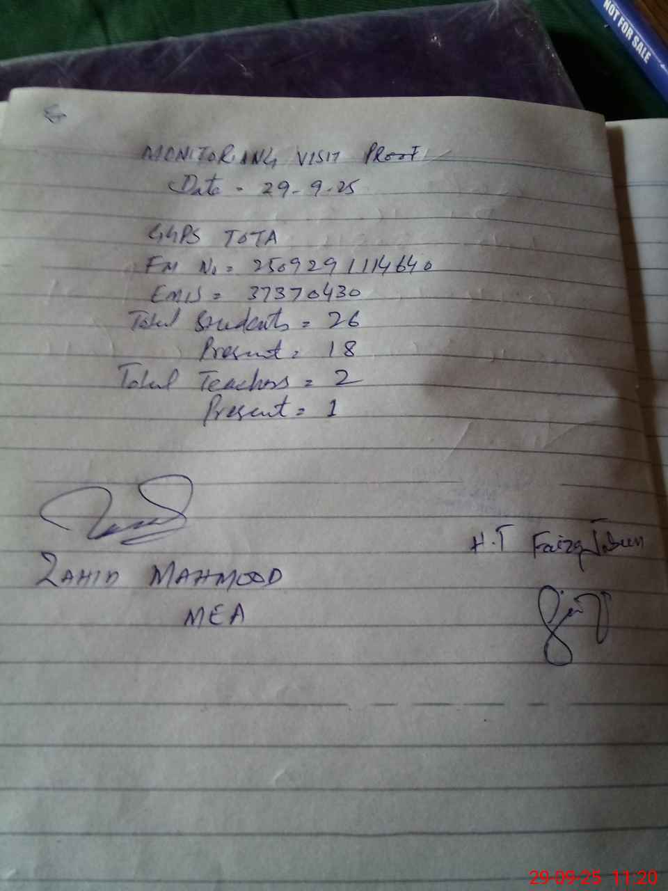 | Attendance Register | Head Teacher | MEA with School | Visit Proof |