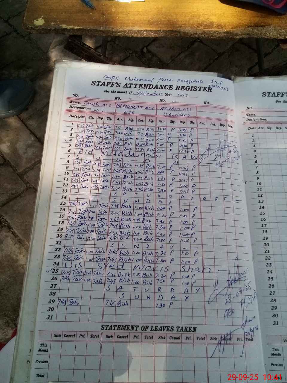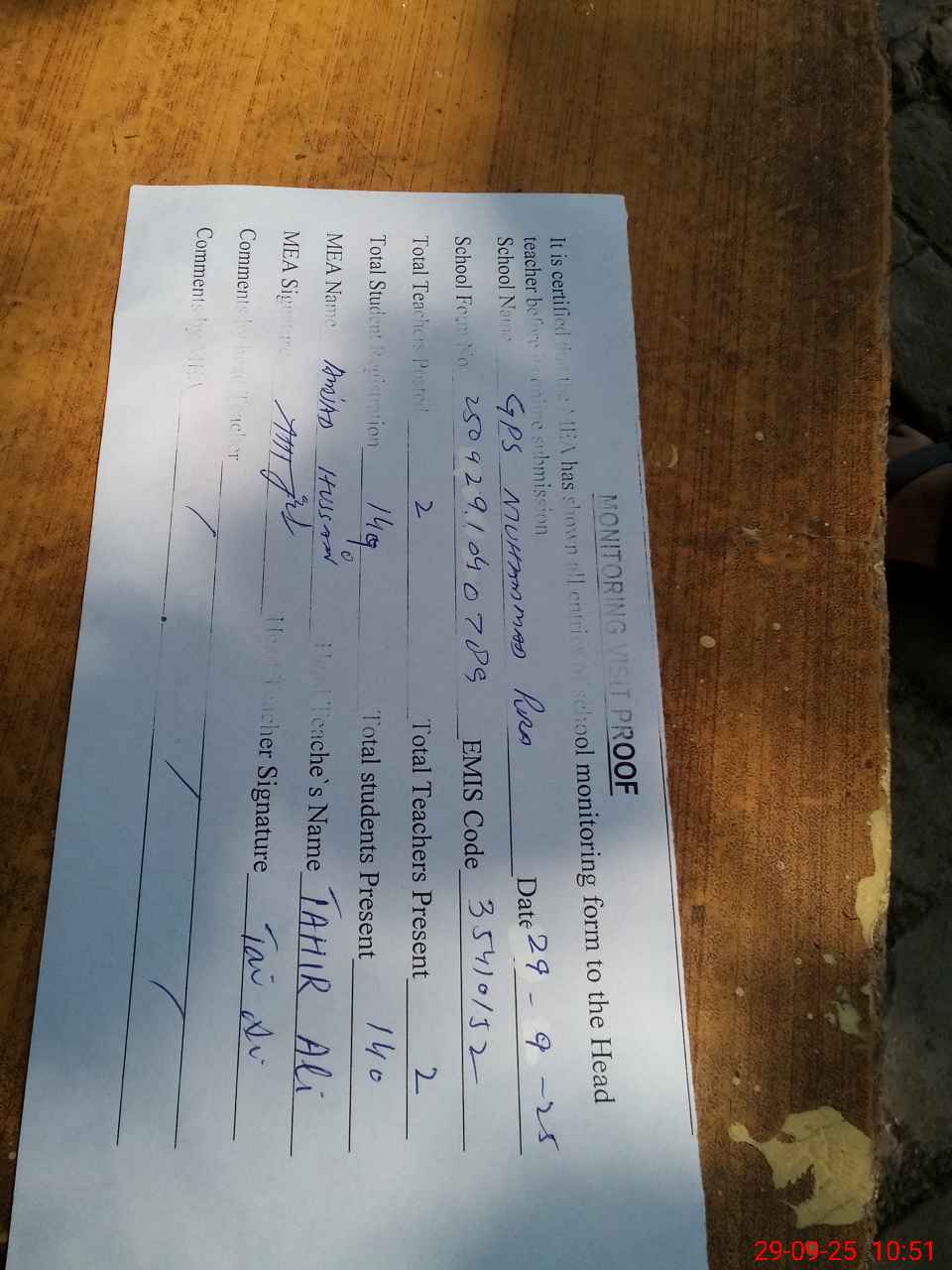 | Attendance Register | Head Teacher | MEA with School | Visit Proof |