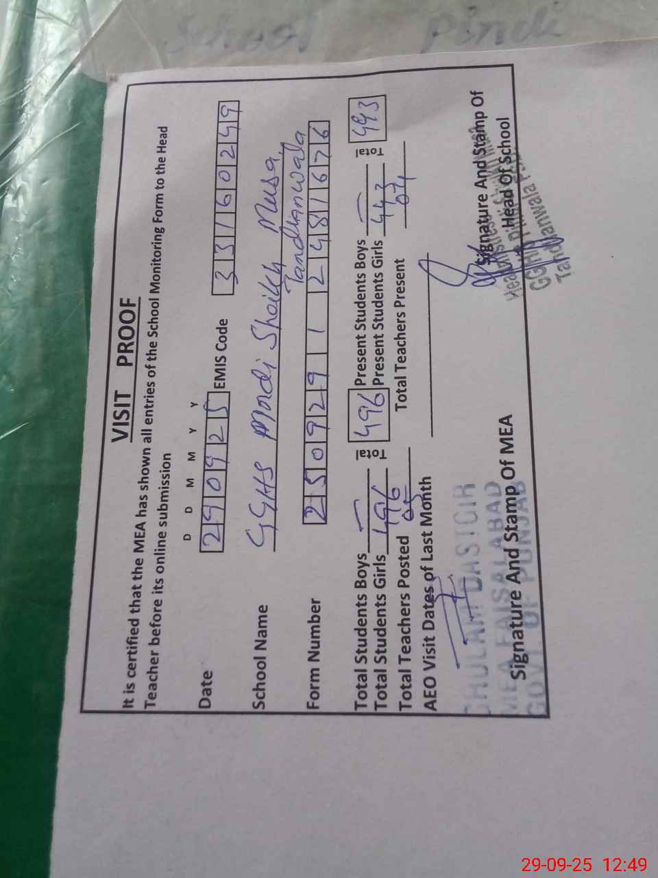 | Certified that this School was Inspected by the Undersigned MEA/DMO Today and the Information Stated Above is as Per Record. | |||||
