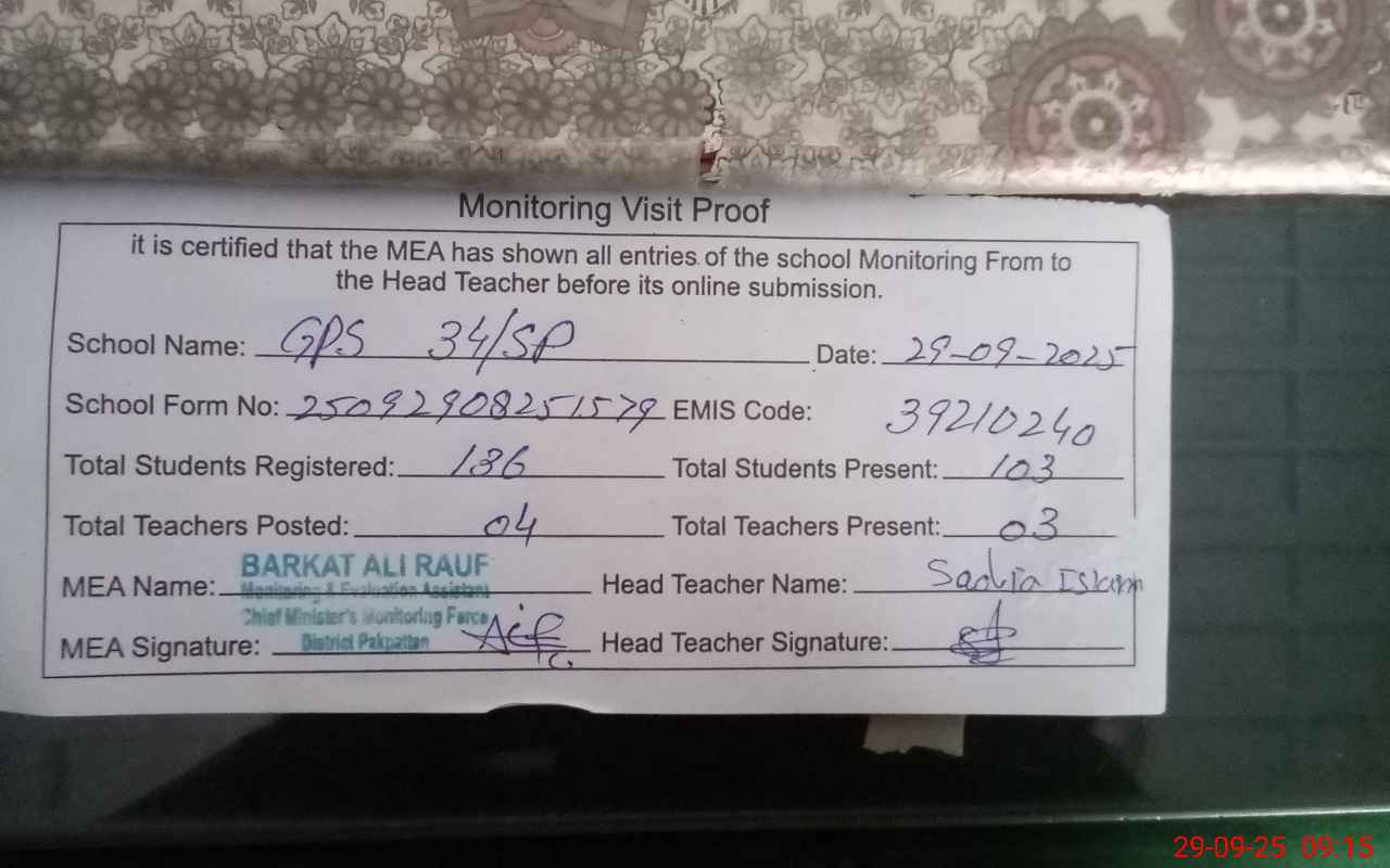 | EMIS Code: 39210240 | Name of School: GPS CHAK NO. 34 SP | |||