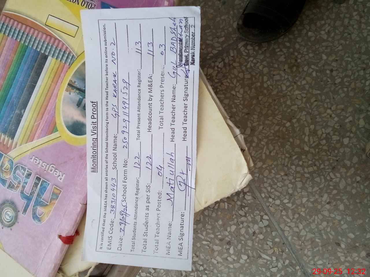 | Attendance Register | Head Teacher | MEA with School | Visit Proof |