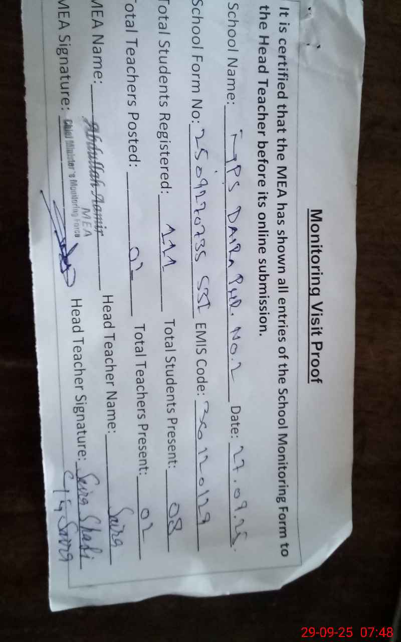 | EMIS Code: 36120129 | Name of School: GPS DAIRA PUR NO. 2 SHUJA ABAD | |||