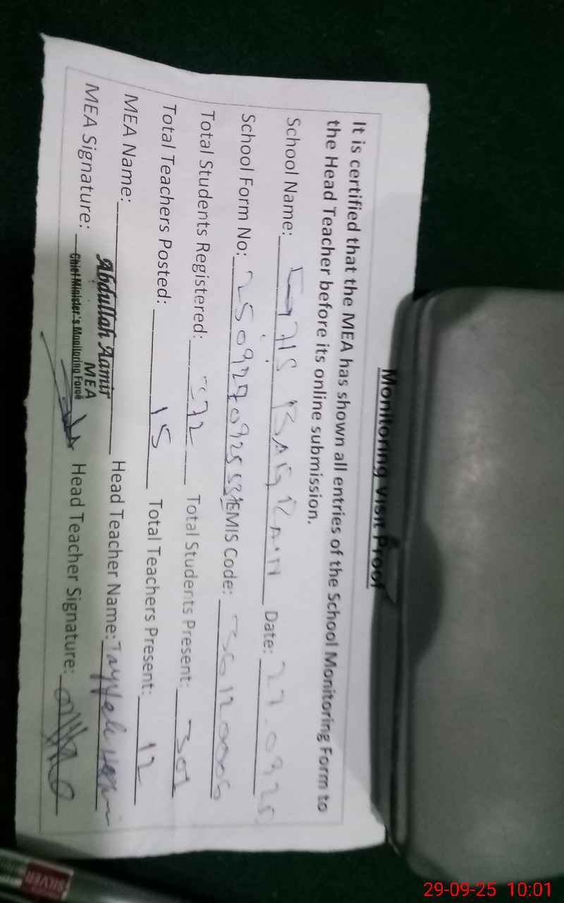 | Attendance Register | Head Teacher | MEA with School | Visit Proof |
