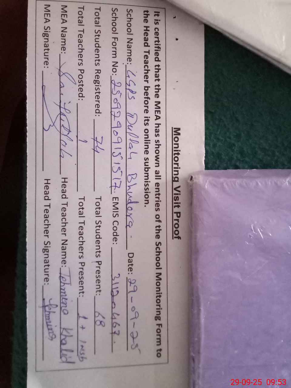 | EMIS Code: 31120467 | Name of School: GGPS DULLAH BHUDERA | |||