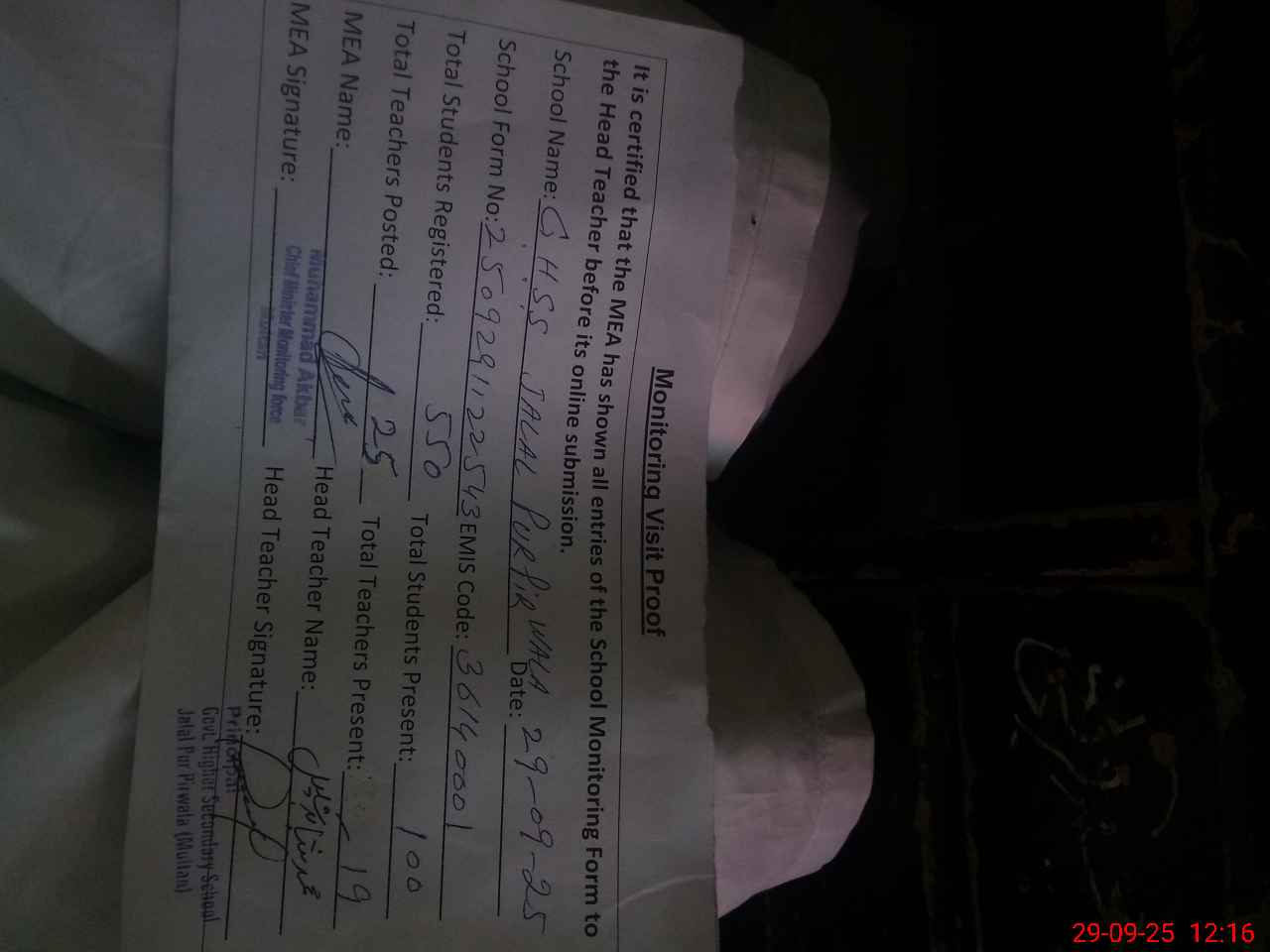 | Attendance Register | Head Teacher | MEA with School | Visit Proof |