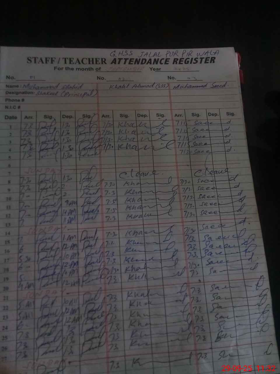 | CNIC | Full Name | Designation | R/C | Absence during last cal. month |