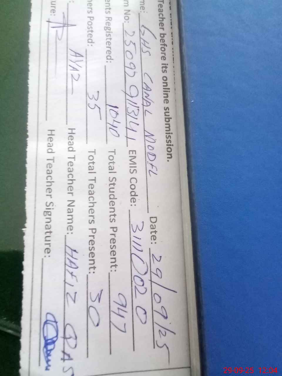 | Name: Ha**** MQa**** Designation: (School Headmaster's/Headmistress's) Principal Phone/Cell Number: 03**** |
