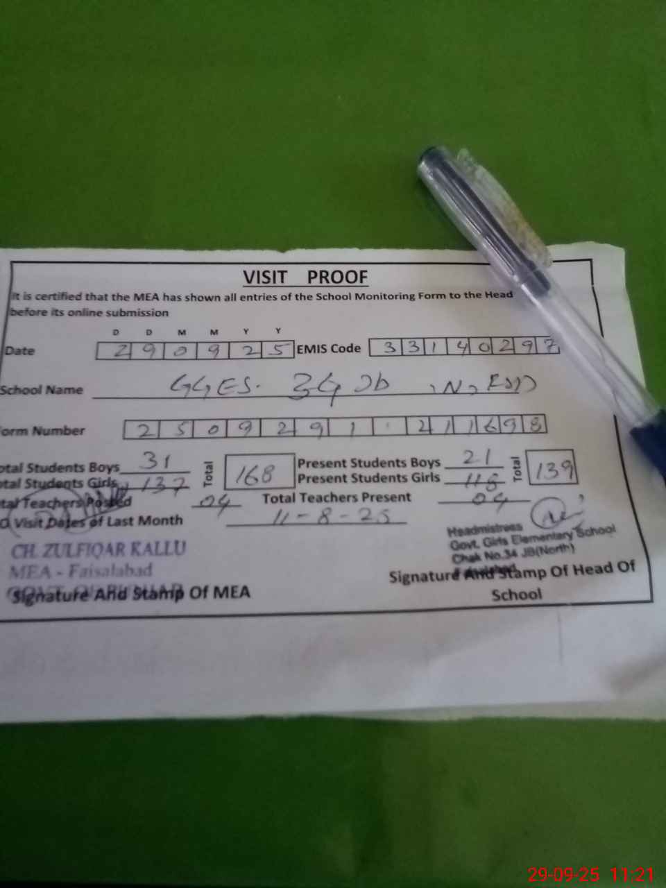 | EMIS Code: 33140297 | Name of School: GGES CHAK 34 JB NORTH | |||
