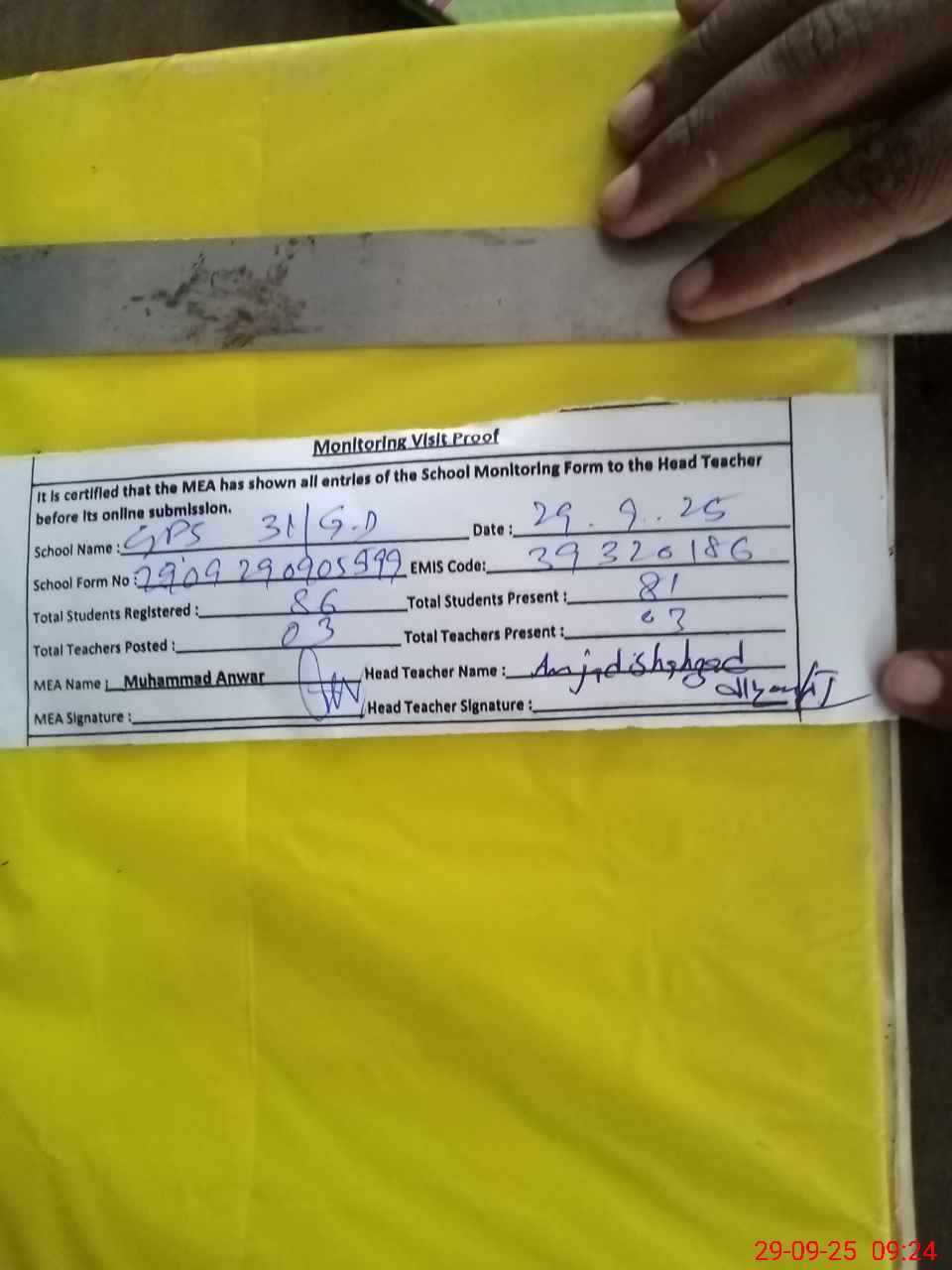 | Attendance Register | Head Teacher | MEA with School | Visit Proof |