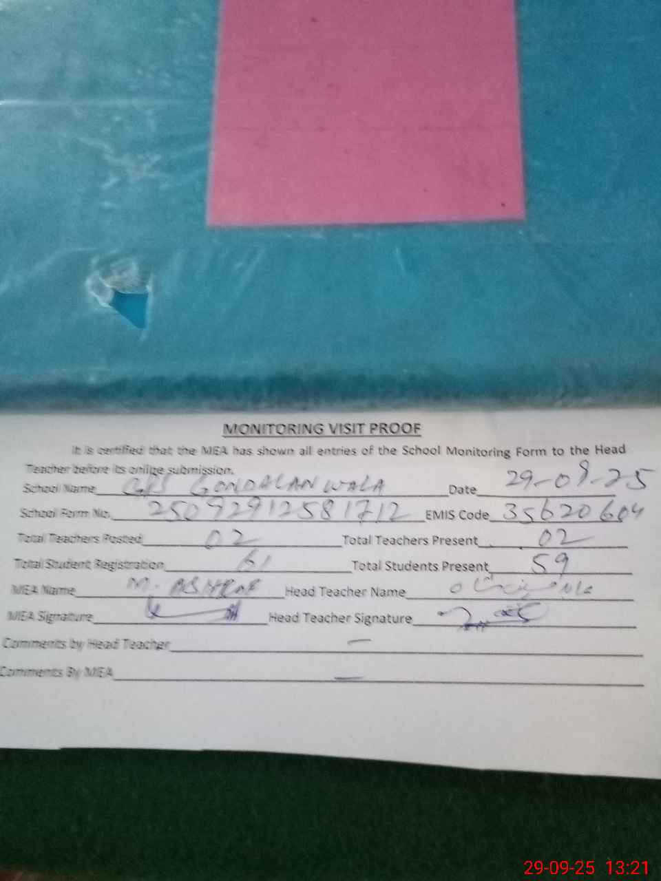 | EMIS Code: 35620604 | Name of School: GPS GONDLAWALA CHAK 20 RB | |||