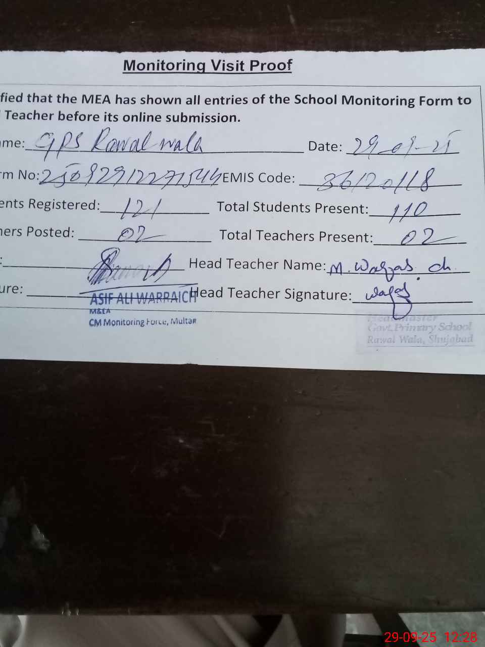 | EMIS Code: 36120118 | Name of School: GPS RAWAL WALA MOZA QAISAR PUR SHUJABAD | |||
