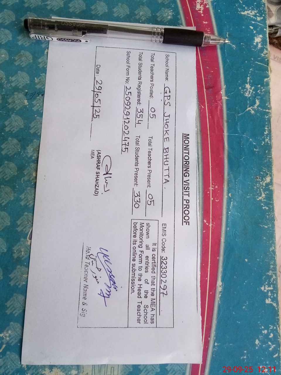 | Attendance Register | Head Teacher | MEA with School | Visit Proof |