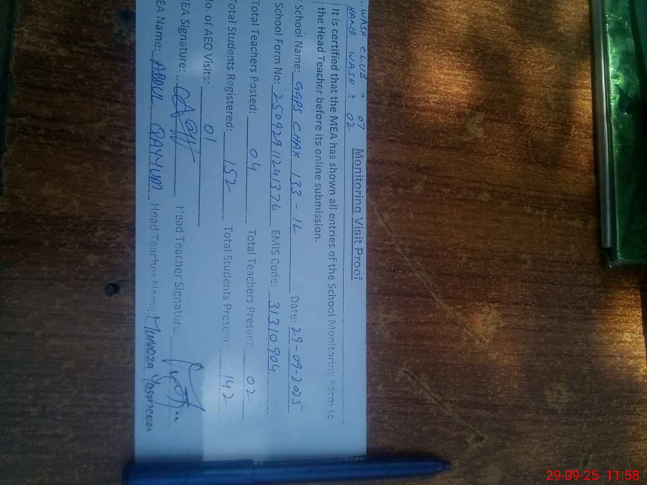 | Attendance Register | Head Teacher | MEA with School | Visit Proof |